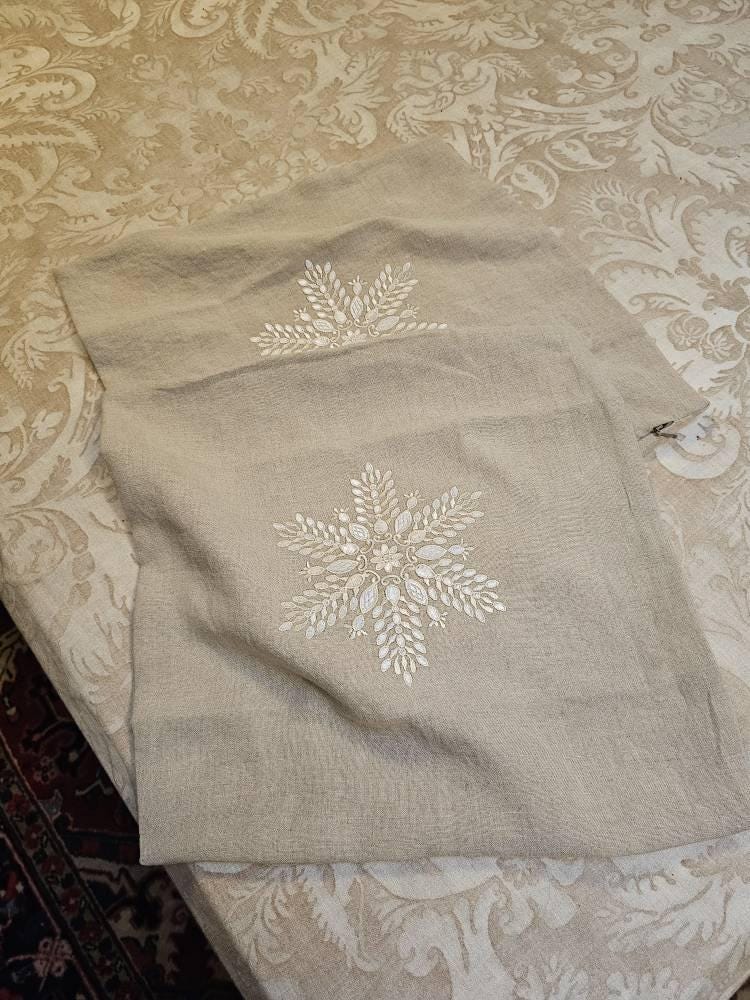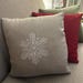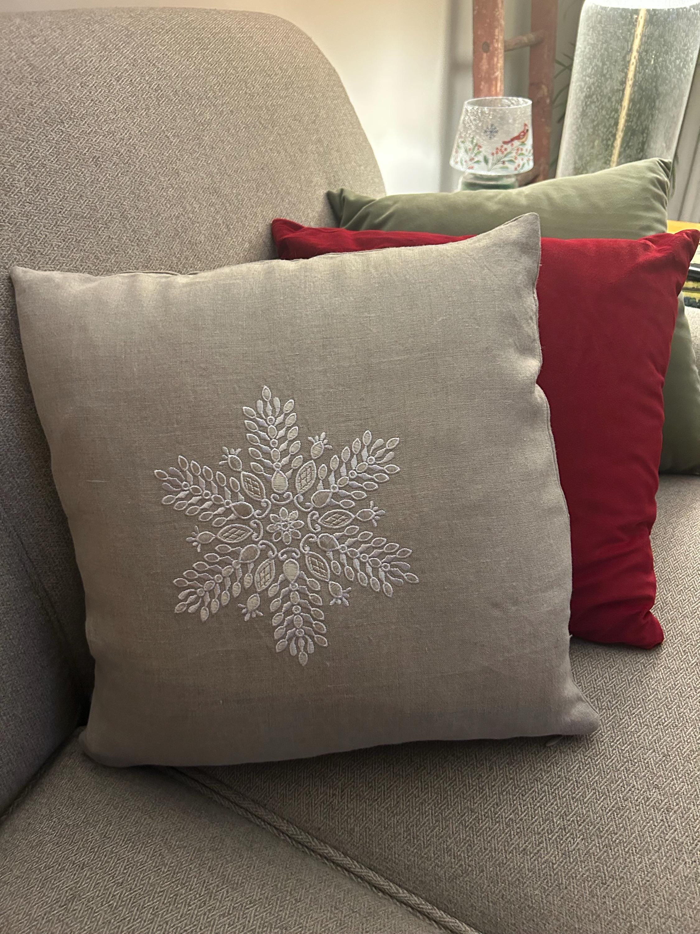 The snowflake design is machine embroidered in white and tan rayon thread onto 100% natural linen fabric. The pillow cover measures 16” x 16”. Invisible zipper closure. All inside edges are serged for durability and a clean finish.