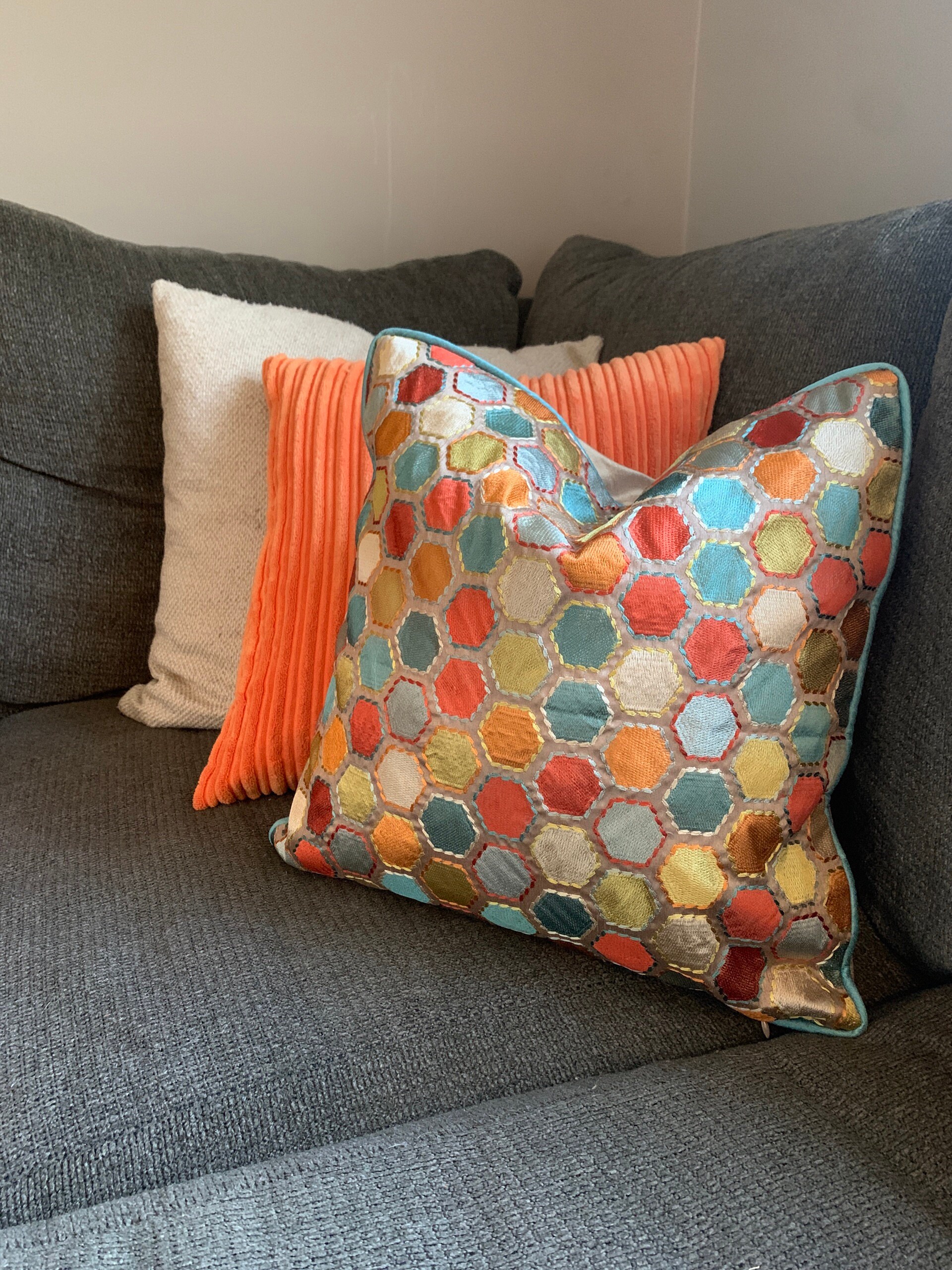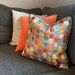Beautiful embroidered fabric on the front side of this lumbar pillow cover The 6-sided hexagons are machine embroidered on the fabric in bright turquoise, orange, burnt orange, tan, ivory and a pale yellow/green. The reverse side is sewn from tan rayon and the cover is edged in turquoise silk. Pillow cover fits a 12 x 18" pillow insert. All inside edges are serged for durability. Invisible zipper closure. This is not designed for a home with pets. Dry cleaning recommended.